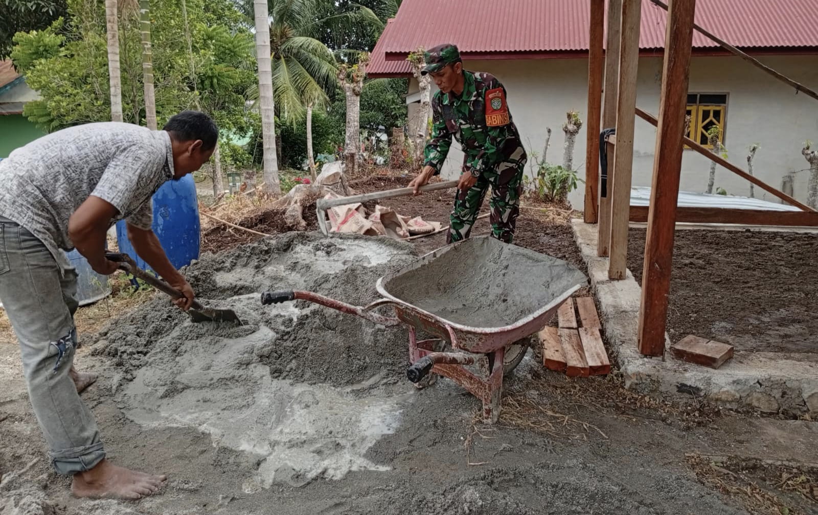 Babinsa 05 Gampong Aneuk Laot, Serka Insarlin, dengan penuh keikhlasan membantu mengaduk campuran semen untuk pengecoran lantai rumah milik Bapak Jalaluddin di Jurong Putro Haloëh, Gampong Aneuk Laot, Kecamatan Sukakarya.
