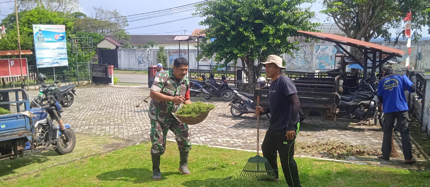 Dengan semangat gotong royong, Babinsa dan warga membersihkan rumput, mengumpulkan sampah, serta merapikan area di sekitar kantor keuchik.