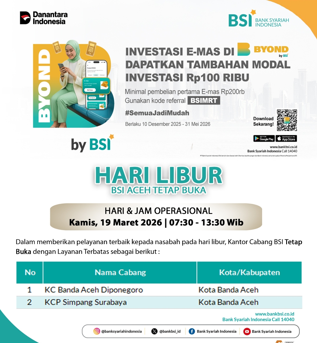 Sebanyak 22 outlet BSI di wilayah Aceh akan tetap beroperasi pada tanggal 18, 19, 23, dan 24 Maret 2026. Layanan ini disiapkan untuk mengakomodasi meningkatnya aktivitas keuangan masyarakat selama periode Hari Raya, mulai dari penarikan tunai hingga transaksi penting lainnya.