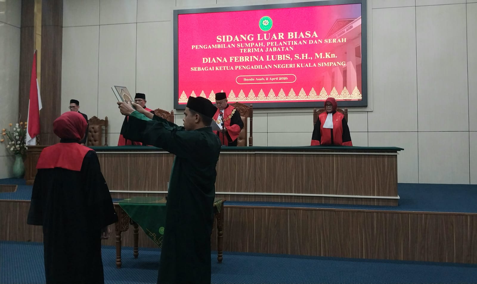 Banda Aceh — Ketua Pengadilan Tinggi (KPT) Banda Aceh, Nursyam, resmi mengambil sumpah dan melantik Diana Febriana Lubis sebagai Ketua Pengadilan Negeri (KPN) Kuala Simpang. Pelantikan tersebut digelar di Ruang Sidang Utama Pengadilan Tinggi Banda Aceh, Rabu (2/4/2026), dalam suasana khidmat.