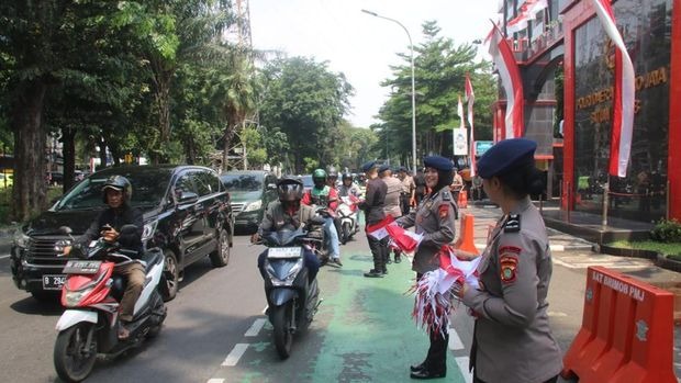Aksi ini dilaksanakan pada Senin (4/8/2025). Sejumlah personel Brimob Polda Metro turun ke jalan sambil mengatur lalu lintas dan membagikan bendera kepada para pengendara.