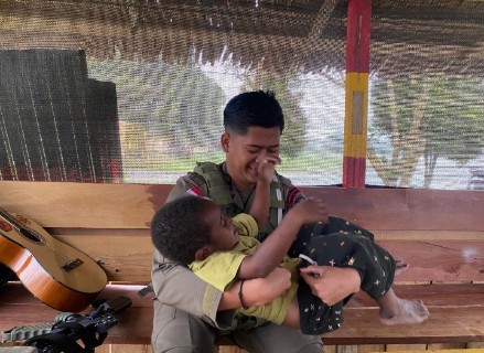 Oksibil – Suasana penuh kehangatan tampak di Posko Operasi Damai Cartenz-2025, Distrik Oksibil, Kabupaten Pegunungan Bintang. Bripda Wahyu terlihat akrab dengan seorang anak kecil, mencerminkan kedekatan antara aparat keamanan dan masyarakat. Momen ini menjadi gambaran nyata peran kepolisian sebagai sahabat anak dalam menciptakan rasa aman di wilayah tersebut.