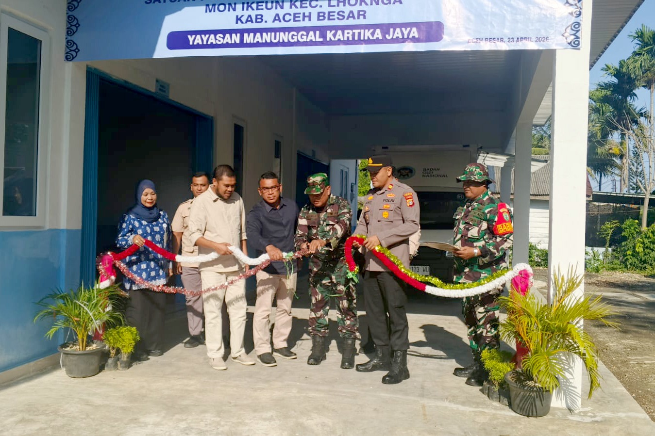 Aceh Besar – Kodim 0101/Kota Banda Aceh (KBA) terus menunjukkan komitmennya dalam mendukung program peningkatan kesejahteraan masyarakat, khususnya di bidang kesehatan dan pemenuhan gizi. Hal ini terlihat dalam kegiatan Launching Satuan Pelayanan Pemenuhan Gizi (SPPG) Yayasan Manunggal Kartika Jaya yang dilaksanakan di Desa Mon Ikeun, Kecamatan Lhoknga, Kabupaten Aceh Besar, Kamis (23/04/2026).