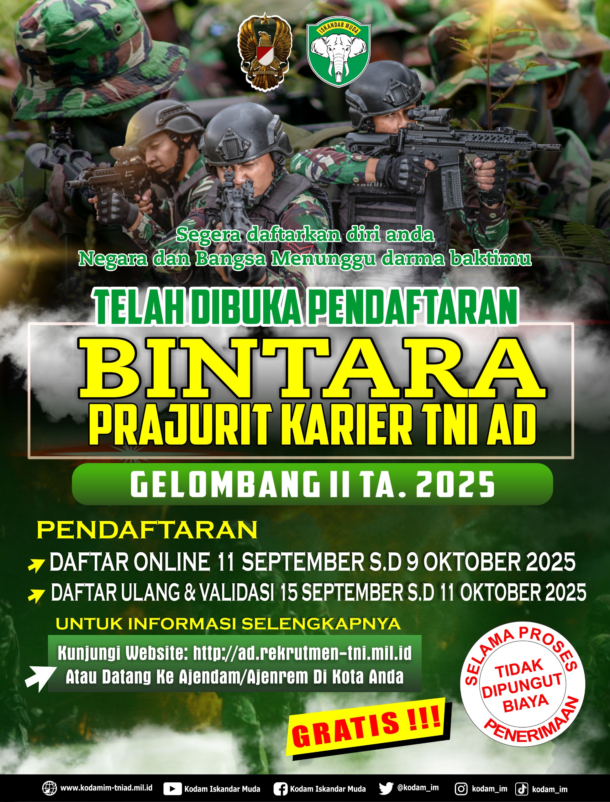 acehindependent.com, BANDA ACEH – Komando Daerah Militer Iskandar Muda (Kodam IM) kembali membuka pintu selebar-lebarnya bagi generasi muda Aceh untuk bergabung Jadi Prajurit TNI AD bagian dari Tentara Nasional Indonesia Angkatan Darat (TNI AD). Tahun Anggaran 2025 ini, Kodam IM membuka pendaftaran Calon Bintara TNI AD Gelombang II (11 September – 9 Oktober 2025) dan Calon Tamtama TNI AD Gelombang III (11 September – 23 Oktober 2025).