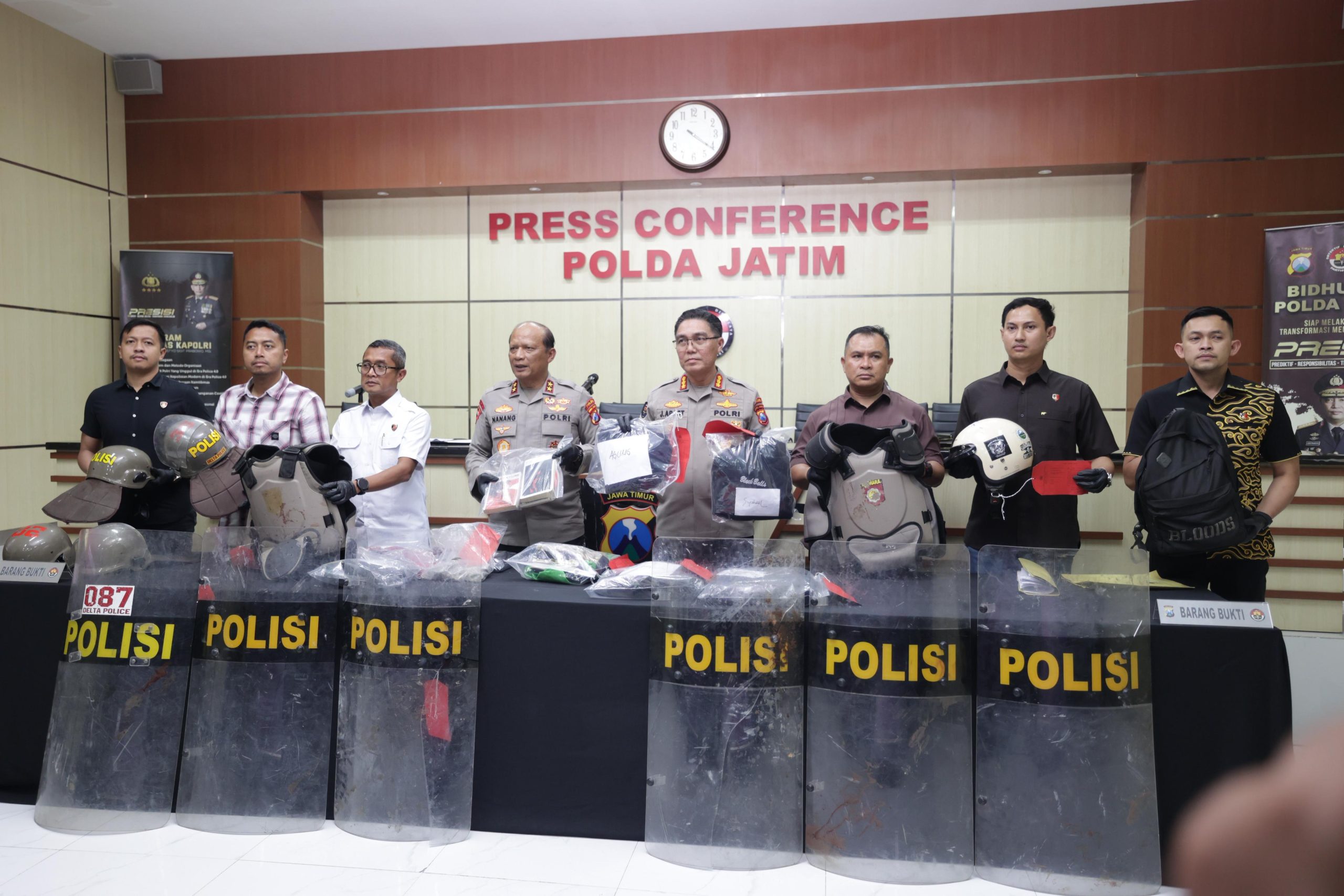 Kapolda Jatim Irjen Pol Drs. Nanang Avianto, M.Si., didampingi Kabid Humas Polda Jatim, Kombes Pol Jules Abraham Abast dan Dirreskrimum Kombes Pol Widi Atmoko, menyampaikan hasil penanganan hukum terkait aksi yang terjadi di wilayah hukum Polda Jawa Timur tersebut.
