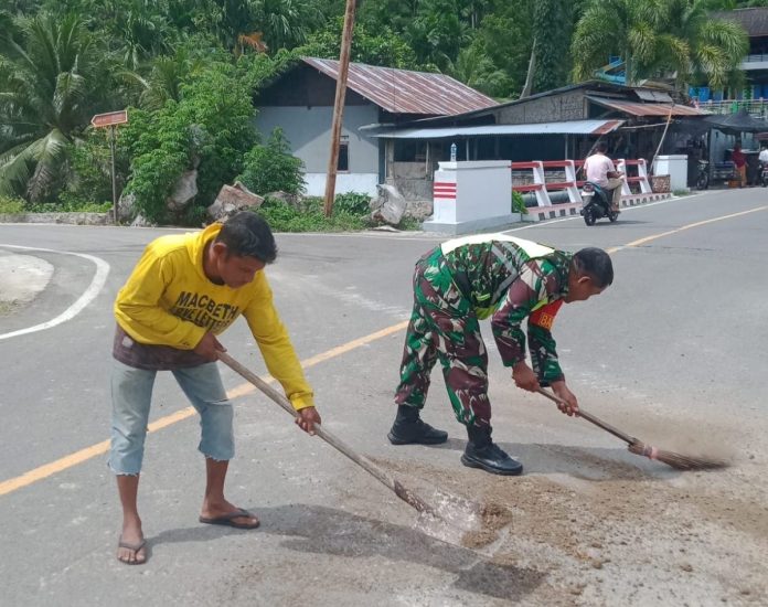 SABANG – Babinsa 02 Koramil 02/Sukakarya Kodim 0112/Sabang, Serma Sutrisno membantu warga binaan membersihkan tumpahan pasir di jalan Jurong Pria Laot Gampong Bateeshoek Kecamatan Sukamakmue Kota Sabang