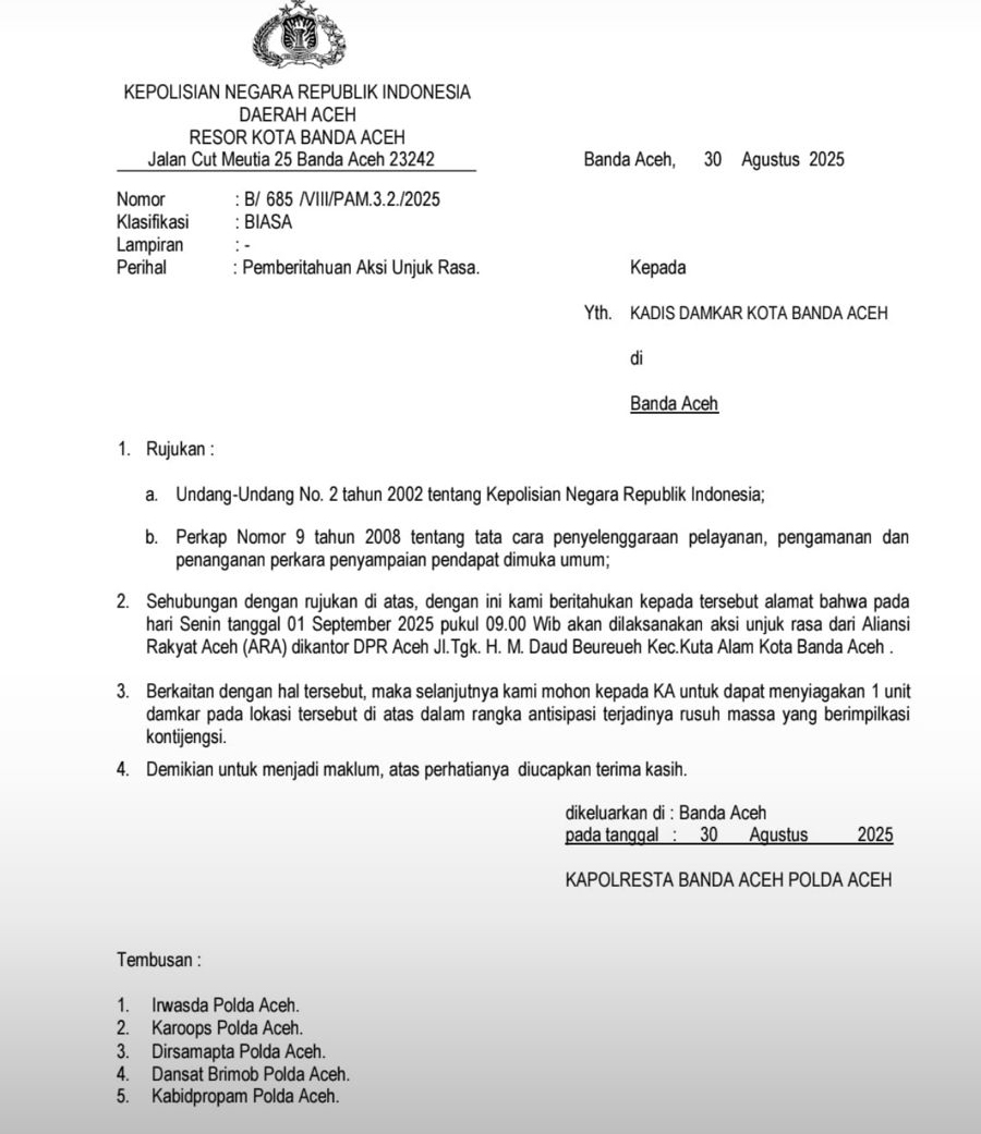 Banda Aceh – Kepolisian Resor Kota (Polresta) Banda Aceh mengumumkan adanya aksi unjuk rasa yang akan digelar oleh Aliansi Rakyat Aceh (ARA) pada Senin, 1 September 2025, pukul 09.00 WIB.