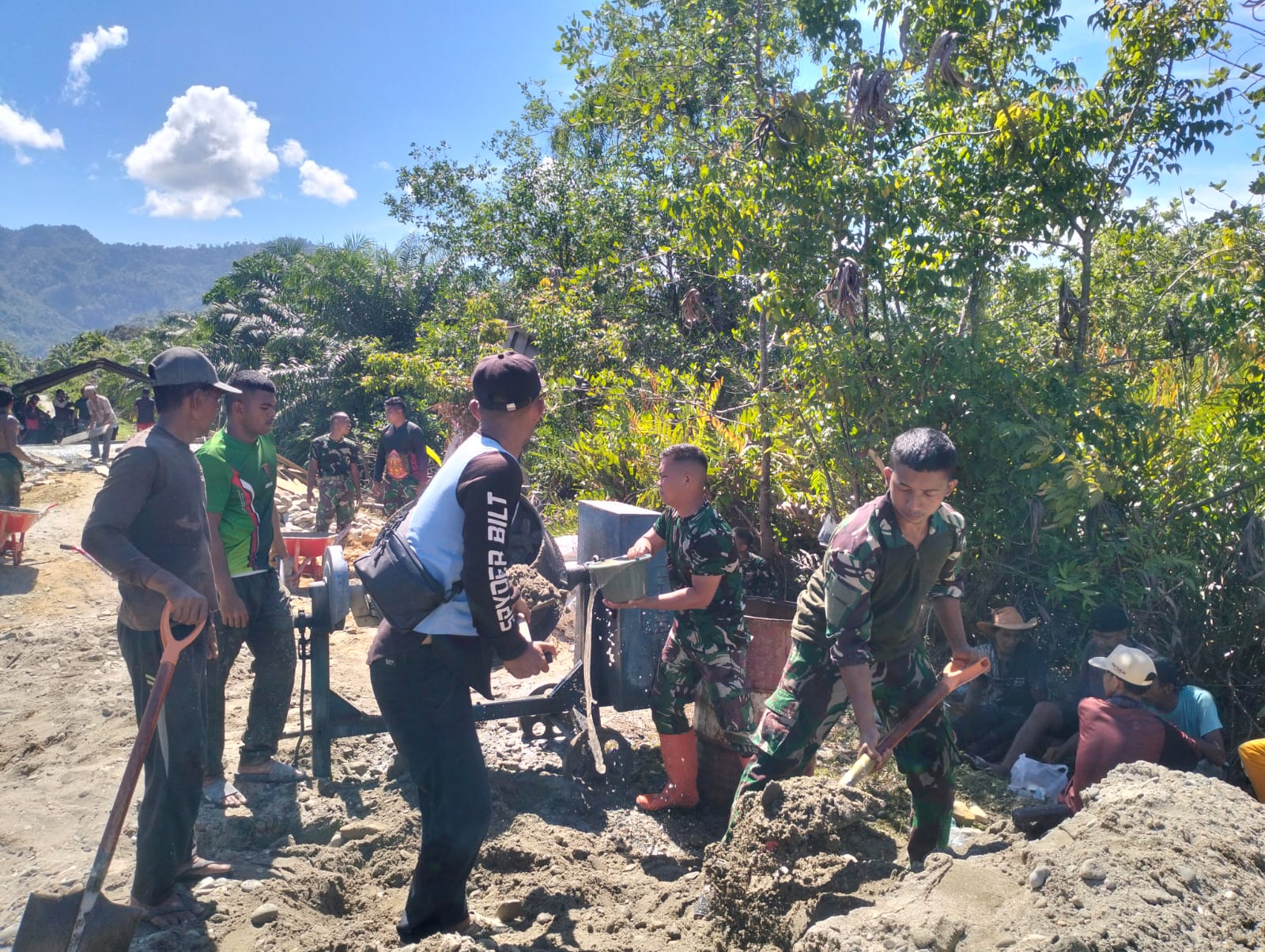 Personel TNI bersama warga setempat tampak terus bekerja tanpa mengenal lelah, mengedepankan semangat gotong royong dalam setiap tahapan pengerjaan. Meskipun dihadapkan pada berbagai tantangan teknis di lapangan, sinergi yang terjalin mampu menjaga ritme pekerjaan tetap berjalan sesuai rencana.