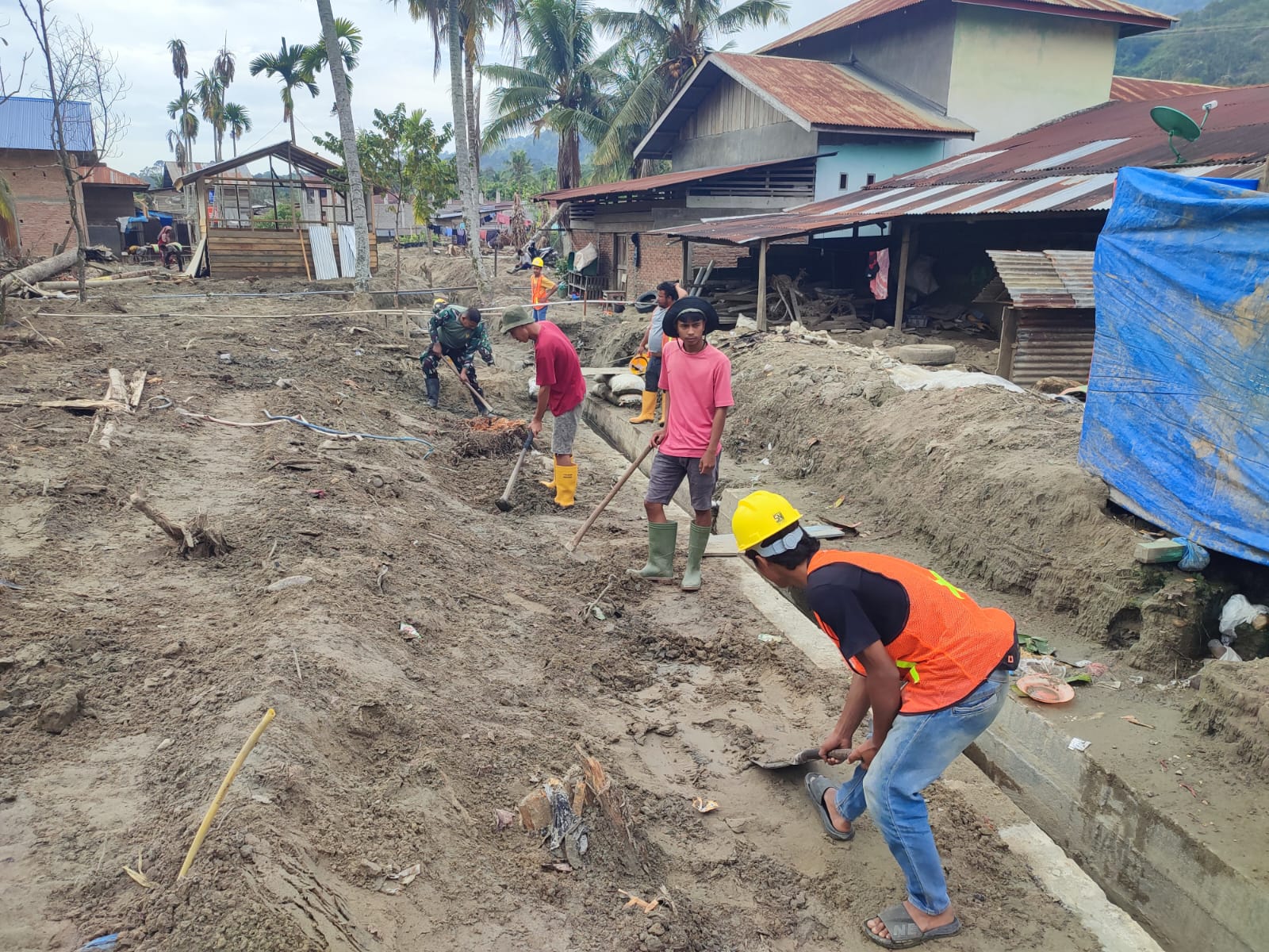 Sejak pagi hari, aparat TNI dan warga terlihat bahu-membahu membersihkan saluran parit yang sebelumnya dipenuhi lumpur, pasir, dan sampah yang menghambat aliran air. Dengan menggunakan peralatan sederhana seperti cangkul, sekop, dan parang, mereka bekerja bersama agar aliran air kembali lancar.